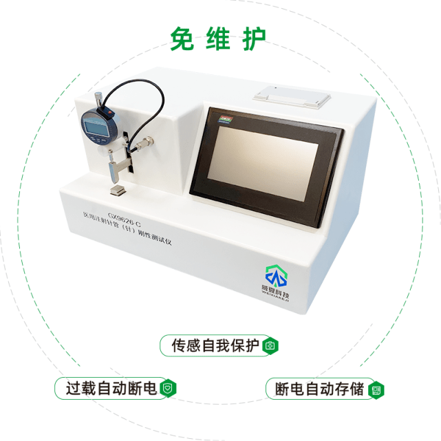 4、仪器自我保护机制。注射针刚性测试仪有传感自我保护机制和过载自动断电机制。一旦操作失误,传感器就触发传感器自我保护机制,能够为企业减低80%的维护成本。在企业业务高峰期时,仪器若是超载运行,则会自动断电来保护仪器及操作者。